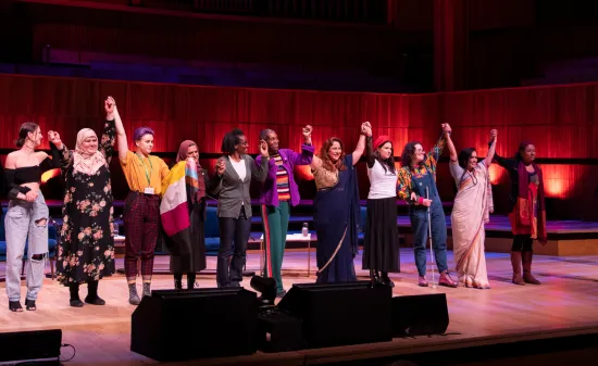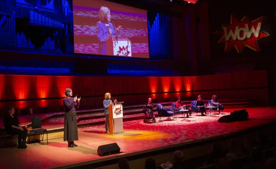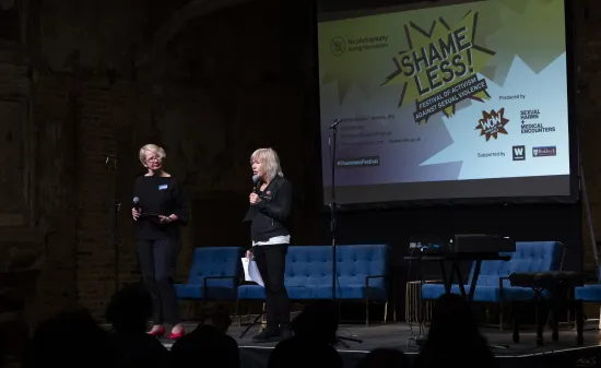 ![Four people sit on a stage with microphones, against colourful lighting and branding that says Shameless! Festival]()